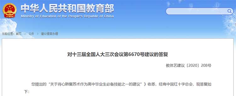 您提出的“关于将心肺复苏术作为高中毕业生必备技能之一的建议”收悉,经商中国红十字总会,现答复如下:
