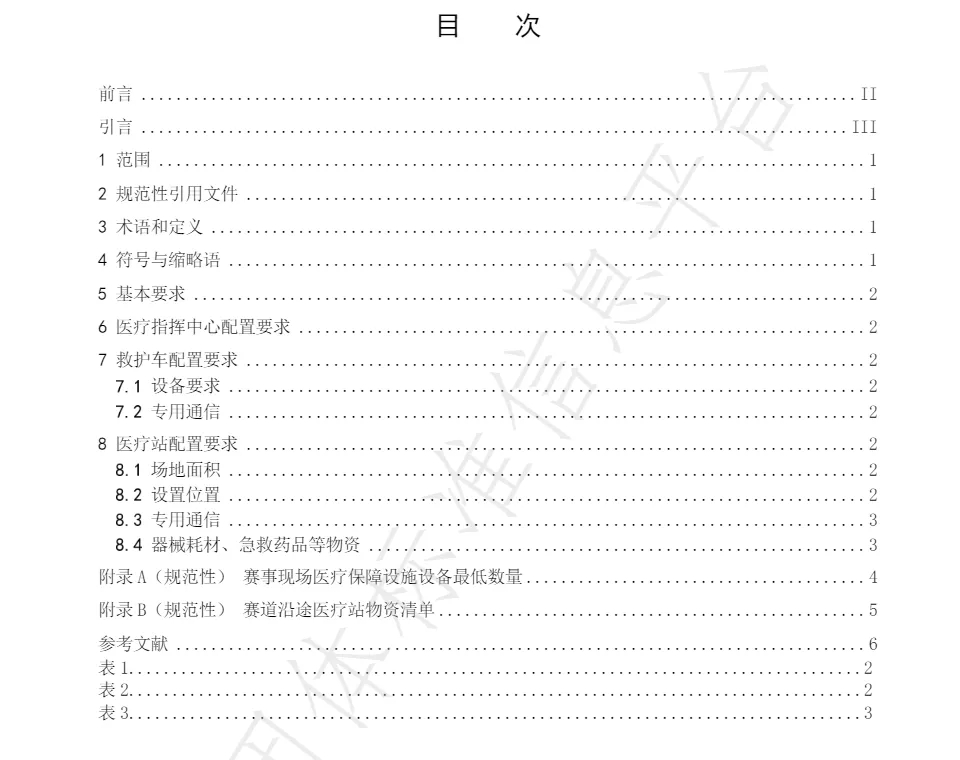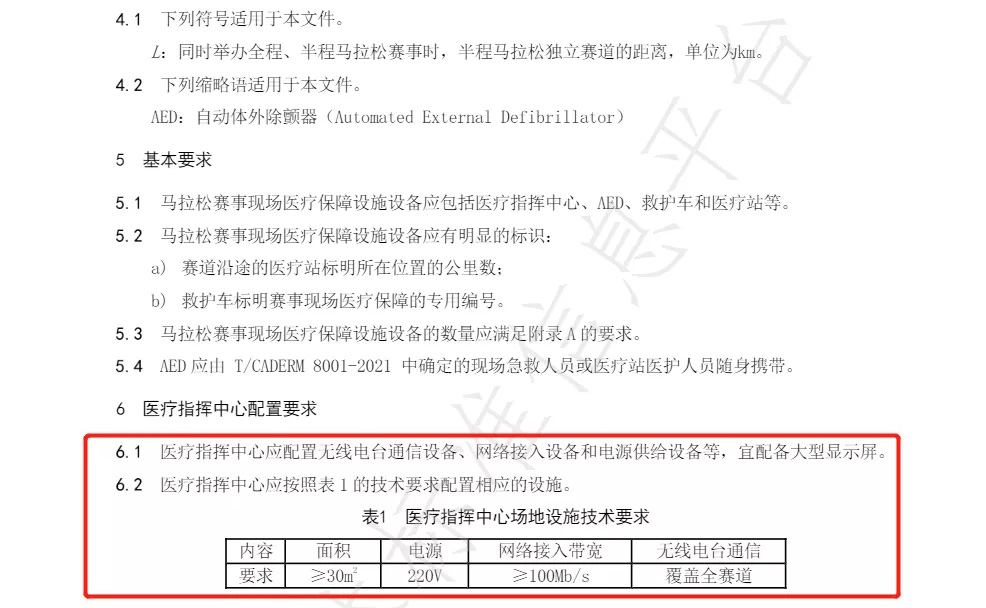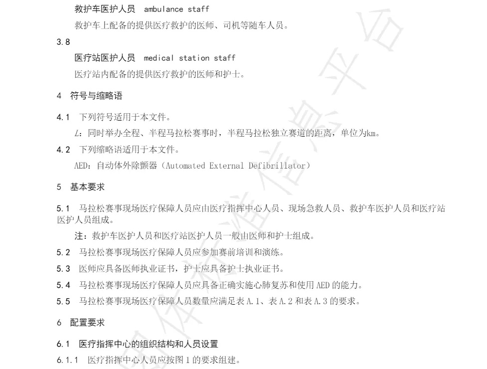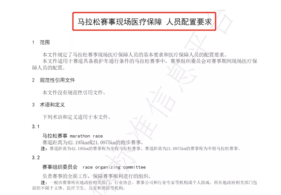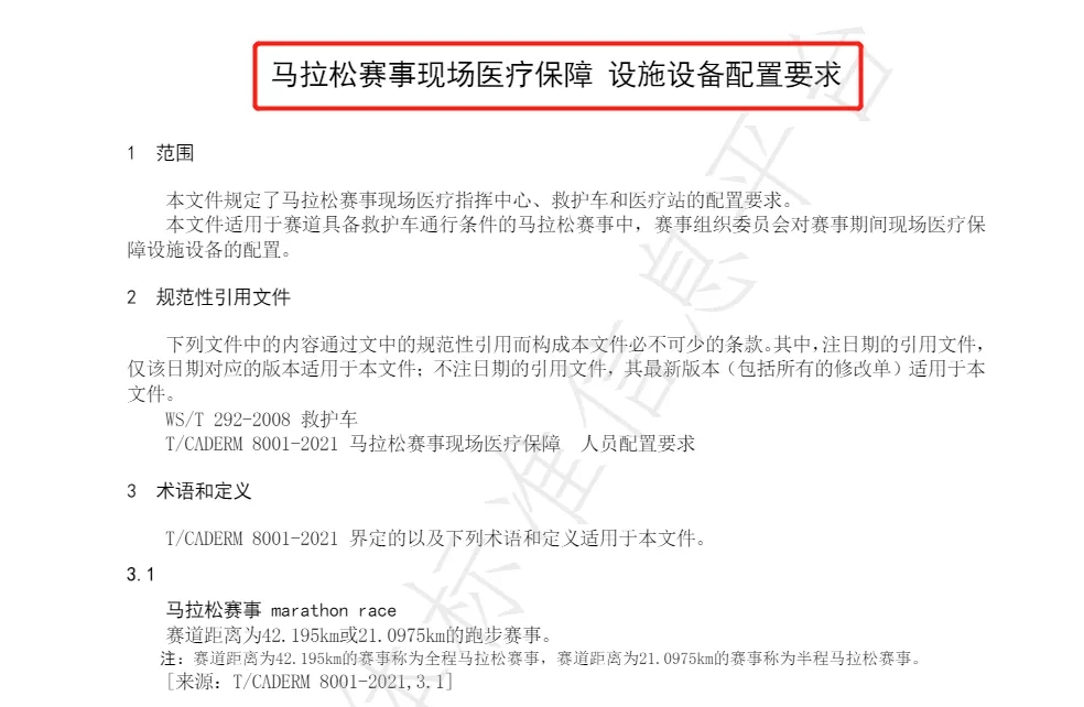 本文件以全程和半程马拉松赛事为研究对象,通过对近十年来数百场次的国内外马拉松的赛事医疗保障的相关政府主管部门、行业协会、赛事公司和第三方专业机构的管理办法、实际案例和相关文献进行深入调研和认真总结,对马拉松赛事现场医疗保障设施设备的配置提出了要求。